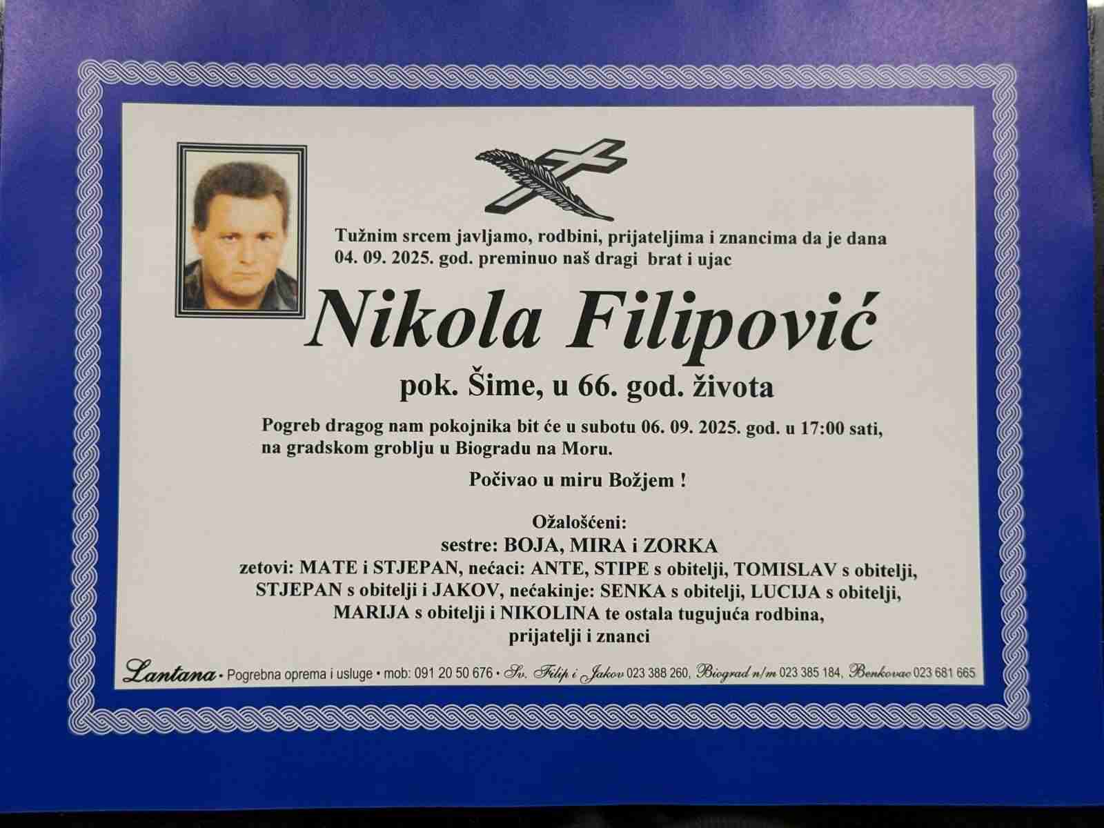 S neizmjernom tugom vas obavještavamo da nas je u 66. godini života napustio naš suborac Nikola Filipović – Đeri iz Biograda na Moru.